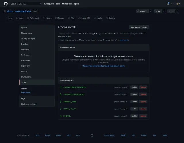 The two environment variables (FIREBASE_ADMIN_CREDENTIAL and FIREBASE_STORAGE_BUCKET) are fetched from Github Secrets.